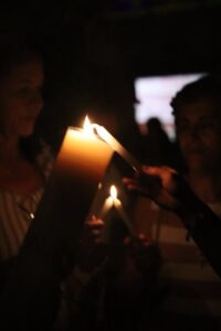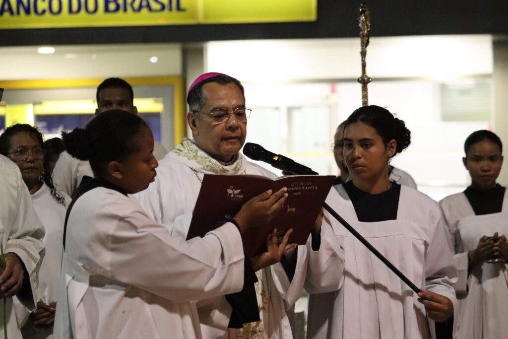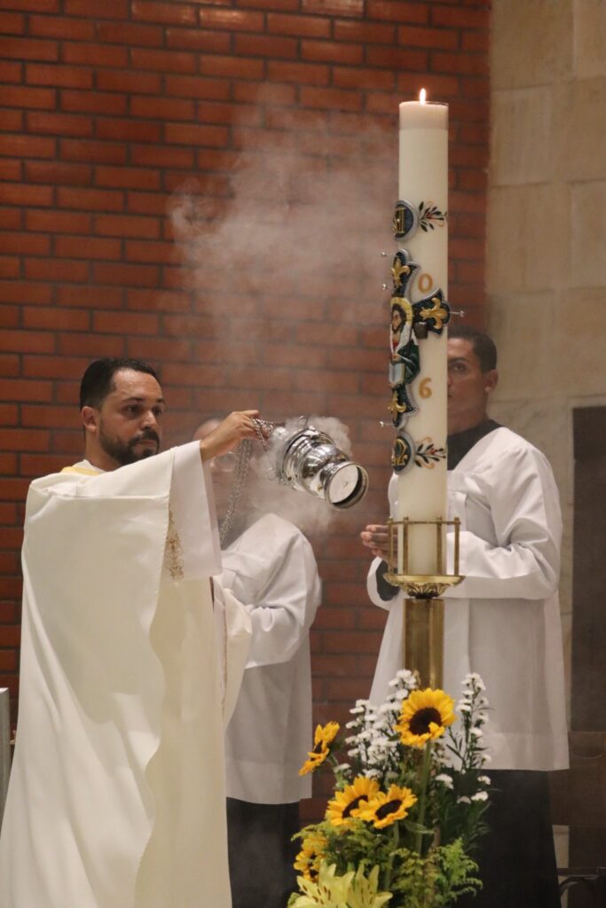 A celebração teve início na praça da igreja, com a bênção do fogo novo e a preparação do Círio Pascal, enquanto a igreja permanecia às escuras, sinal da espera vigilante pela luz de Cristo Ressuscitado.